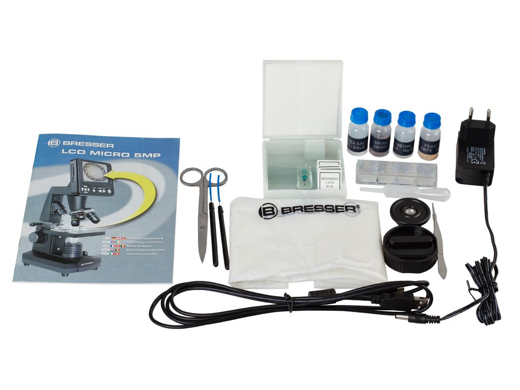 Mikroskop Bresser LCD 50–2000x se dodává s bohatou sadou příslušenství, které je nepostradatelné pro začínající biology.