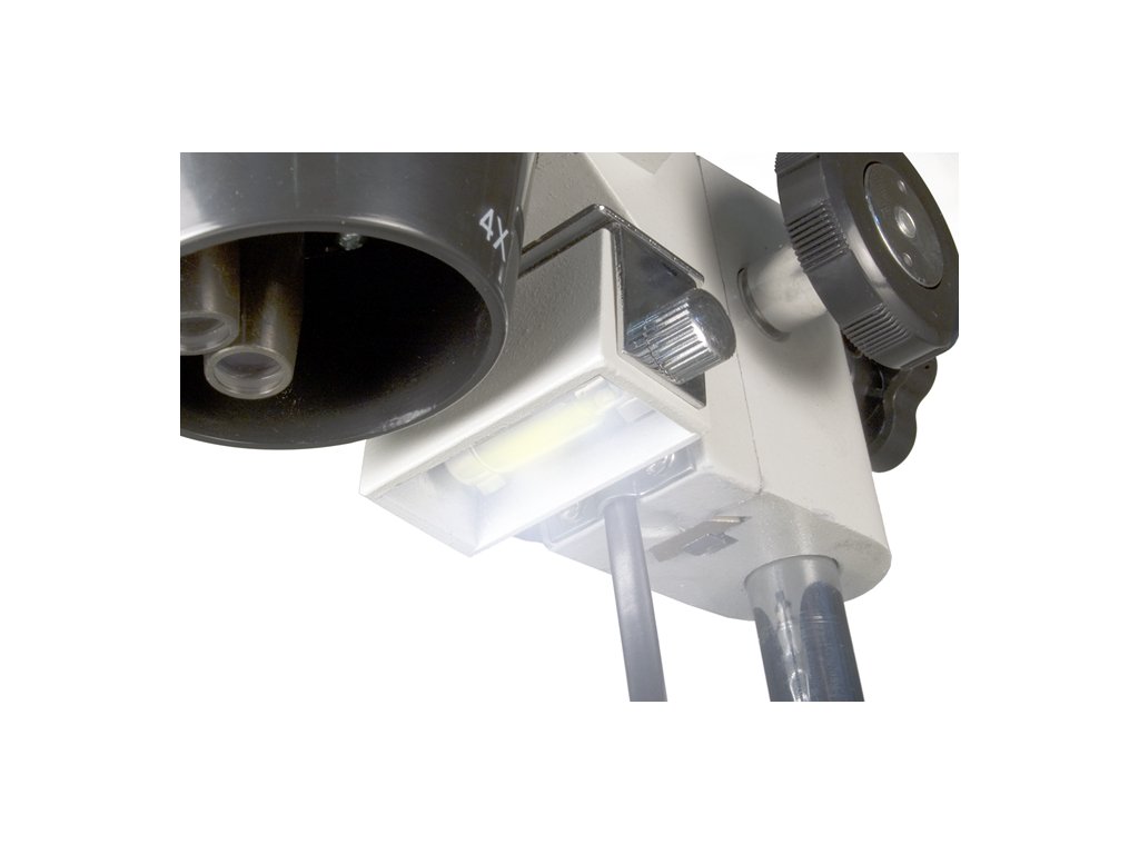 Mikroskop je vybaven zabudovaným osvětlením (horním i dolním), díky němuž můžete mikroskop používat i ve tmě. Použité halogenové žárovky jsou mimořádně úsporné a zároveň mají i dlouhou životnost. Pro ještě pohodlnější pozorování můžete pracovní nastavit stolek tak, aby byl otočen černou nebo bílou stranou nahoru, a přitom preparát upevnit pomocí užitečných svorek.