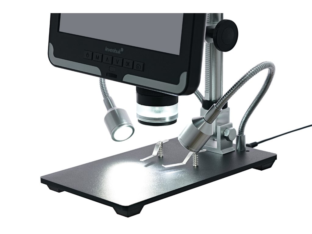 Mikroskop je vybaven osvětlením shora pomocí systému LED diod. Některé z nich se nacházejí v objektivu mikroskopu a dvě LED světla se nacházejí na dvou flexibilních držácích. Tento systém osvětlení umožňuje přesnější osvětlení pracovní oblasti a získání trojrozměrného obrazu. Jas osvětlené lze regulovat pomocí malého regulátoru na napájecím kabelu. Na něm se nachází také vypínač mikroskopu.