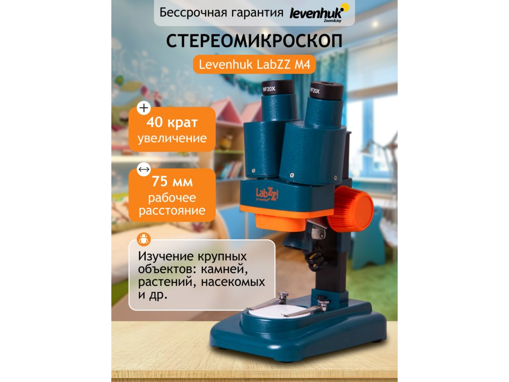 Stereomikroskop Levenhuk LabZZ M4 je skvělá volba při studiu velkých objektů. Tento mikroskop poskytuje stereoskopický obraz a má velkou pracovní vzdálenost 75 mm. Je vhodný k pozorování mincí, minerálů, hornin, hmyzu nebo rostlin. Díky svým malým rozměrům a nízké hmotnosti bude stereomikroskop Levenhuk LabZZ M4 ideálním zařízením pro každého mladého vědce, který má zájem o biologii.