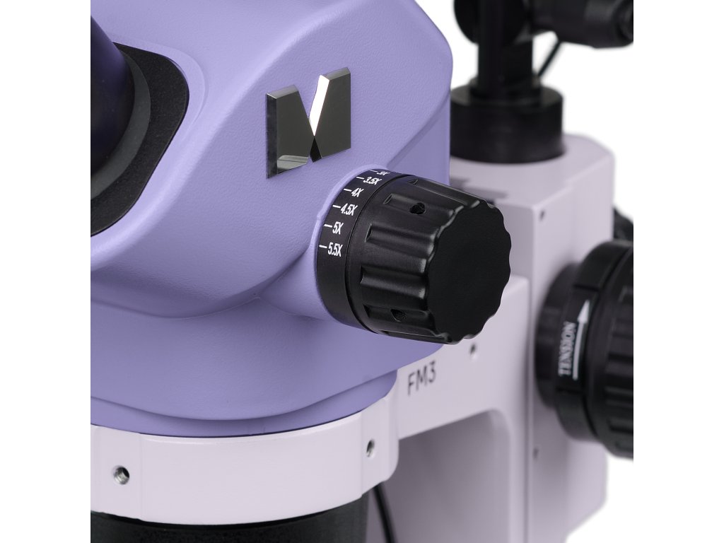 Objektiv se zoomem umožňuje plynulou změnu zvětšení až na 8,4x bez ztráty ostrosti. Mikroskop vytváří vzpřímený (nikoliv převrácený) trojrozměrný obraz. Pomocný objektiv 0,5x mění rozsah zvětšení, zorné pole a pracovní vzdálenost mikroskopu.
