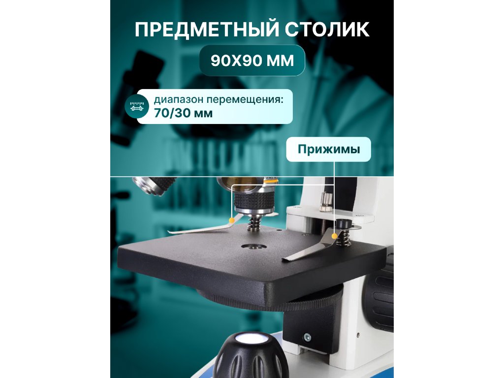 Vzorky jsou na stolku upevněny pomocí držáků vzorků a kotoučové aperturní clony. Osvětlení je duální: LED diody jsou umístěny na obou stranách stolku. K dispozici je funkce nastavení jasu. Osvětlení lze napájet ze sítě nebo z baterií.
