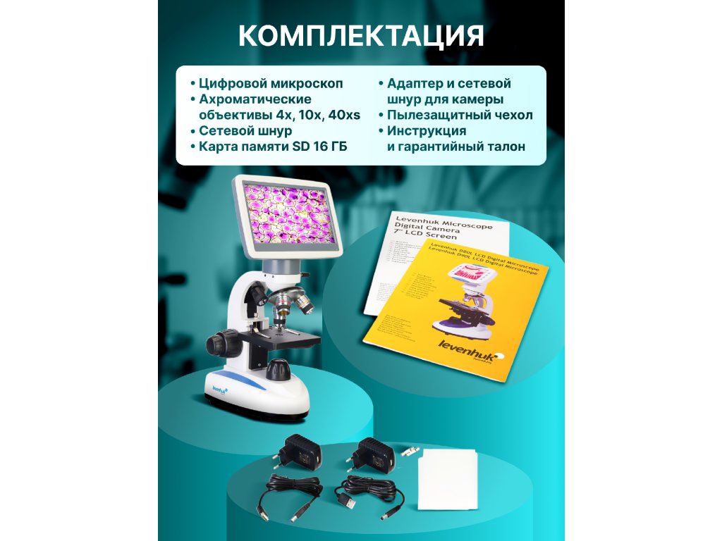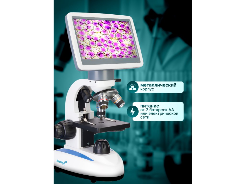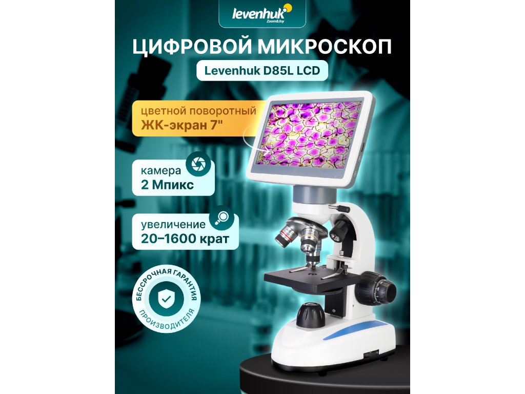 Mikroskop Levenhuk D85L LCD je určen ke zkoumání preparátů s různou průhledností vzorků při zvětšení 40x–1600x. Mikroskop je také vybaven vestavěným 2 Mpx fotoaparátem, který může pořizovat fotografie vzorků a nahrávat videa pro výzkum. Data se ukládají na paměťovou kartu. Další specifickou vlastností tohoto modelu je jeho velká 7" LCD obrazovka, která se skvěle hodí pro podrobné a komplexní zkoumání vzorků.
