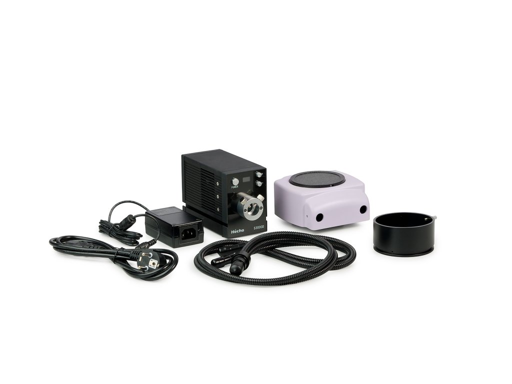 Mezi hlavici mikroskopu a objektiv se zoomem je namontován nástavec. Světelný zdroj je v krytu svítilny. Kryt svítilny je k nástavci připojen pomocí flexibilního duálního světlovodu. Světlo vstupuje do nástavce přes světlovod a poté je přes objektiv nasměrováno na vzorek. Tato metoda osvětlení umožňuje získat jasný obraz bez odlesků a stínů, a to i při velkém zvětšení objektivu mikroskopu.