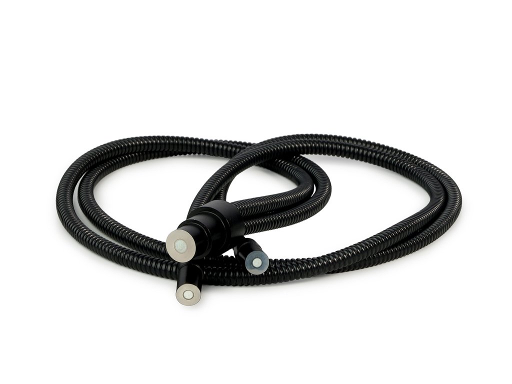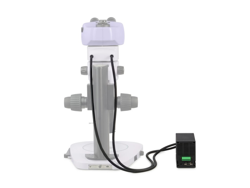 Mezi hlavici mikroskopu a objektiv se zoomem je namontován nástavec. Světelný zdroj je v krytu svítilny. Kryt svítilny je k nástavci připojen pomocí flexibilního duálního světlovodu. Světlo vstupuje do nástavce přes světlovod a poté je přes objektiv nasměrováno na vzorek. Tato metoda osvětlení umožňuje získat jasný obraz bez odlesků a stínů, a to i při velkém zvětšení objektivu mikroskopu.