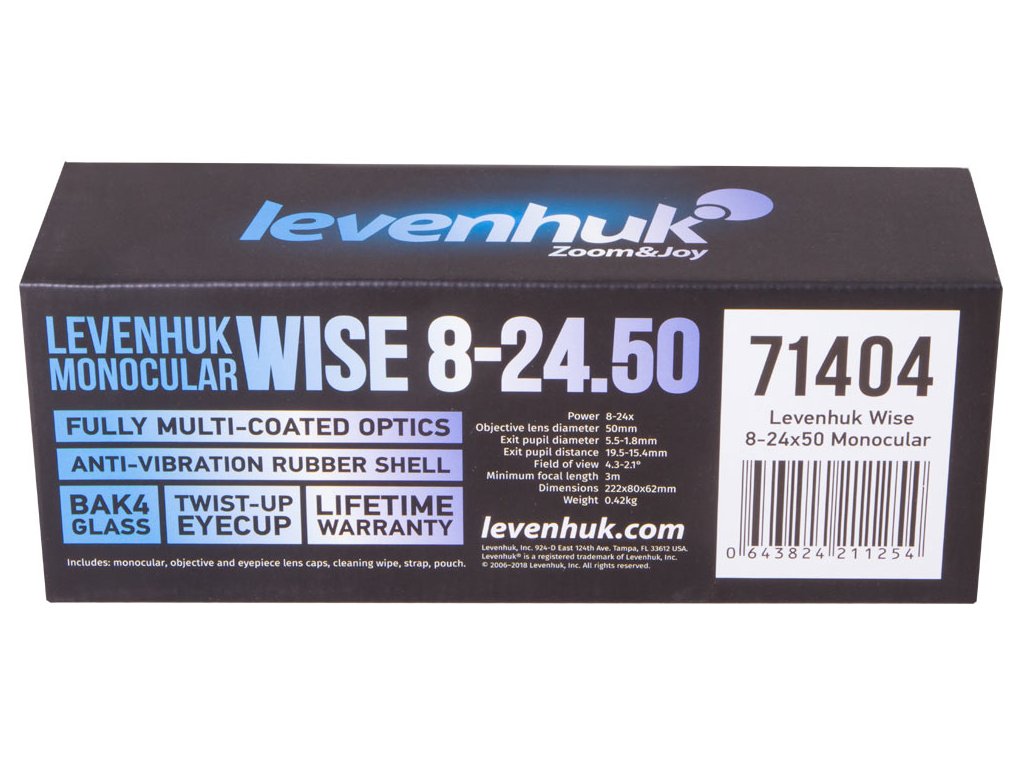 Levenhuk Wise 8–24x50 je monokulární dalekohled s vysokou světelností s proměnným zvětšením v rozsahu od 8x do 24x. Tento výkonný a spolehlivý optický přístroj doporučujeme zakoupit všem cestovatelům, turistům a pozorovatelům přírody a zvěře v ní žijící. Dokážete s ním též podrobně sledovat architektonické prvky v historických centrech měst. Proměnné zvětšení přispívá k univerzálnosti použití tohoto optického přístroje – velké objekty lze snadno pozorovat a zaostřovat na sledované objekty při nízkém zvětšení. Navíc dokážete podrobně sledovat malý cíl při maximálním zvětšení.