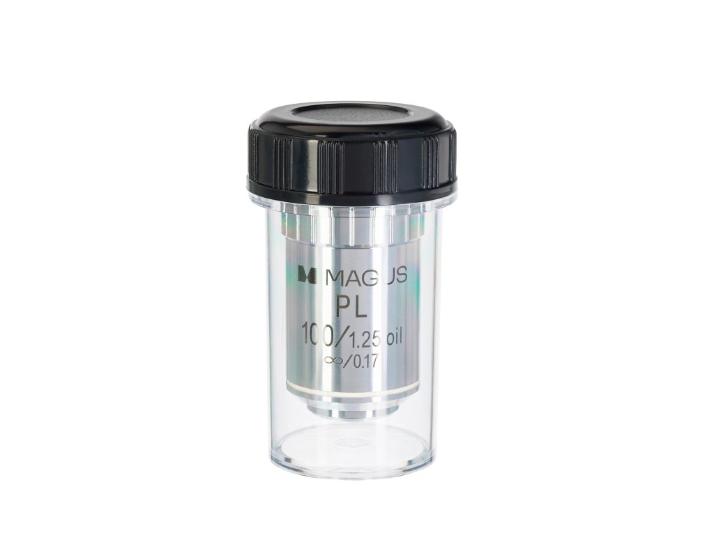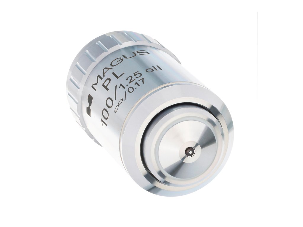 Objektiv pro pozorování ve světlém poli. Limit rozlišení objektivu 100x/1,25 činí 0,22 µm. Chromatická aberace je korigována pro modré a červené, sférická aberace pro zelené světlo a zakřivení pole je korigováno na 90 % průměru zorného pole.