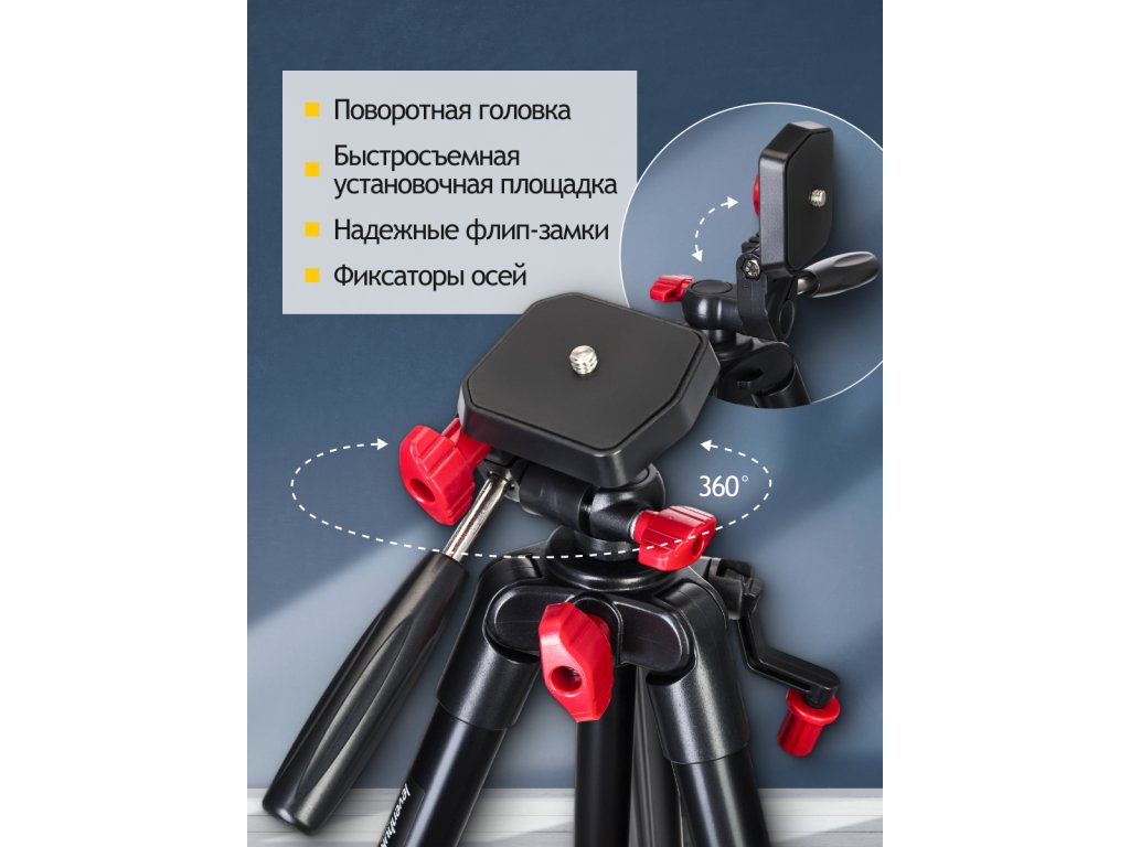 Hlavu stativu lze otáčet o 360° a rovněž zvedat nebo spouštět. Stativ lze ovládat pomocí pohodlné pákové rukojeti. Horizontální deska se standardním 1/4" závitem umožňuje rychlou instalaci a demontáž zařízení. Plošinu lze překlápět vertikálně až o 90°. Tato funkce je vhodná pro fotografování, kdy je nutné rychle změnit polohu rámečku z horizontálního na vertikální. Všechny osy stativu mají aretační knoflíky.