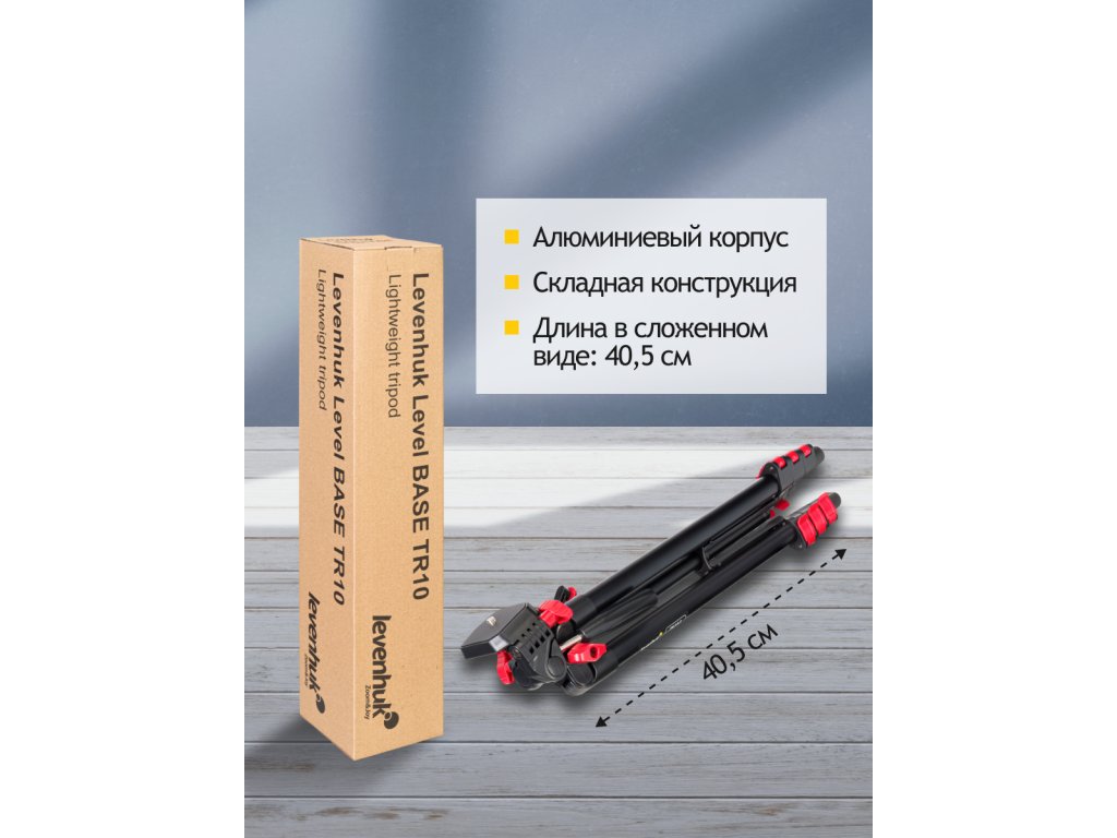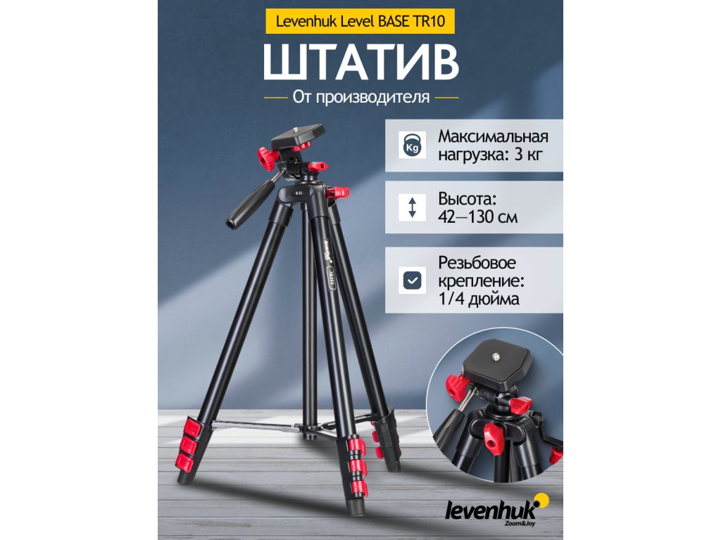 Levenhuk Level BASE TR10 je lehký podlahový stativ-stojan, který je vhodný na výlety a turistiku. Můžete na něj nainstalovat celou řadu zařízení, včetně zrcadlovek, videokamer, optických a osvětlovacích zařízení, projektorů, smartphonů atd. Některé z těchto zařízení mohou při instalaci potřebovat adaptér (není součástí dodávky). Maximální nosnost tohoto stativu je 3 kg.