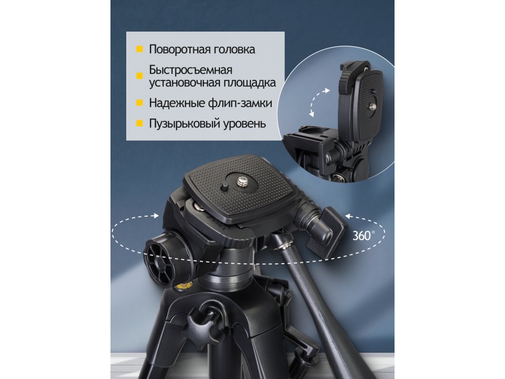 Výšku každé nohy stativu lze nastavit samostatně. Díky systému flip-lock to zvládnete rychle a snadno. Středový sloupek můžete také zvednout nebo spustit. Pro dosažení maximální stability můžete na háček středového sloupku zavěsit závaží. Maximální nosnost stativu je 5 kg. Bublinková vodováha umožňuje nastavení instalované kamery rovnoběžně se zemí.