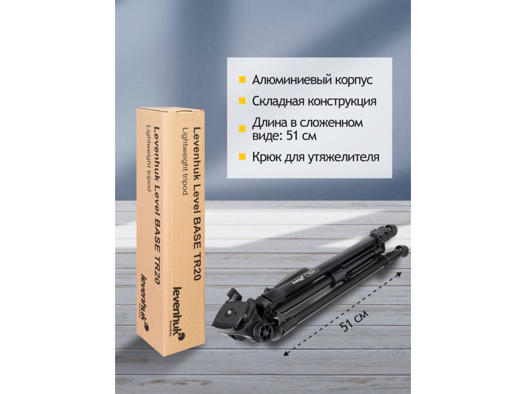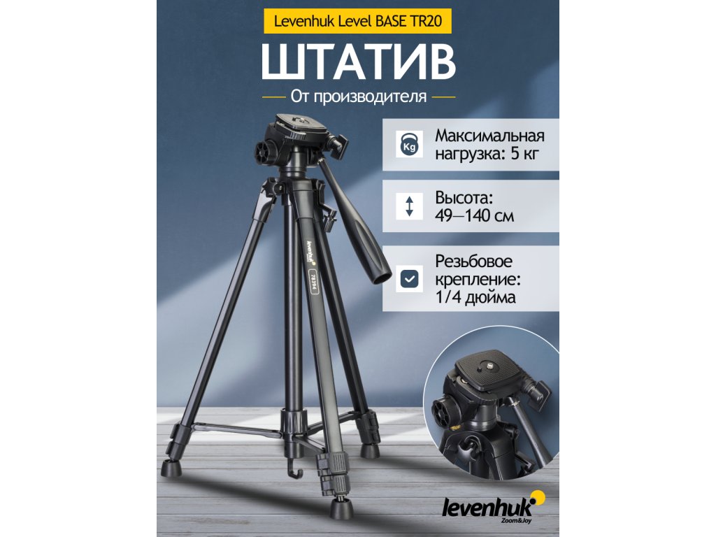 Levenhuk Level BASE TR20 je třísekční podlahový stativ-stojan. Můžete na něj nainstalovat jakékoliv zařízení nebo příslušenství s 1/4" závitem. Nejlépe se hodí pro instalaci vybavení pro fotografování a natáčení videa, optických zařízení, smartphonů a osvětlovacích těles. K instalaci některých zařízení budete možná potřebovat adaptér (není součástí dodávky).