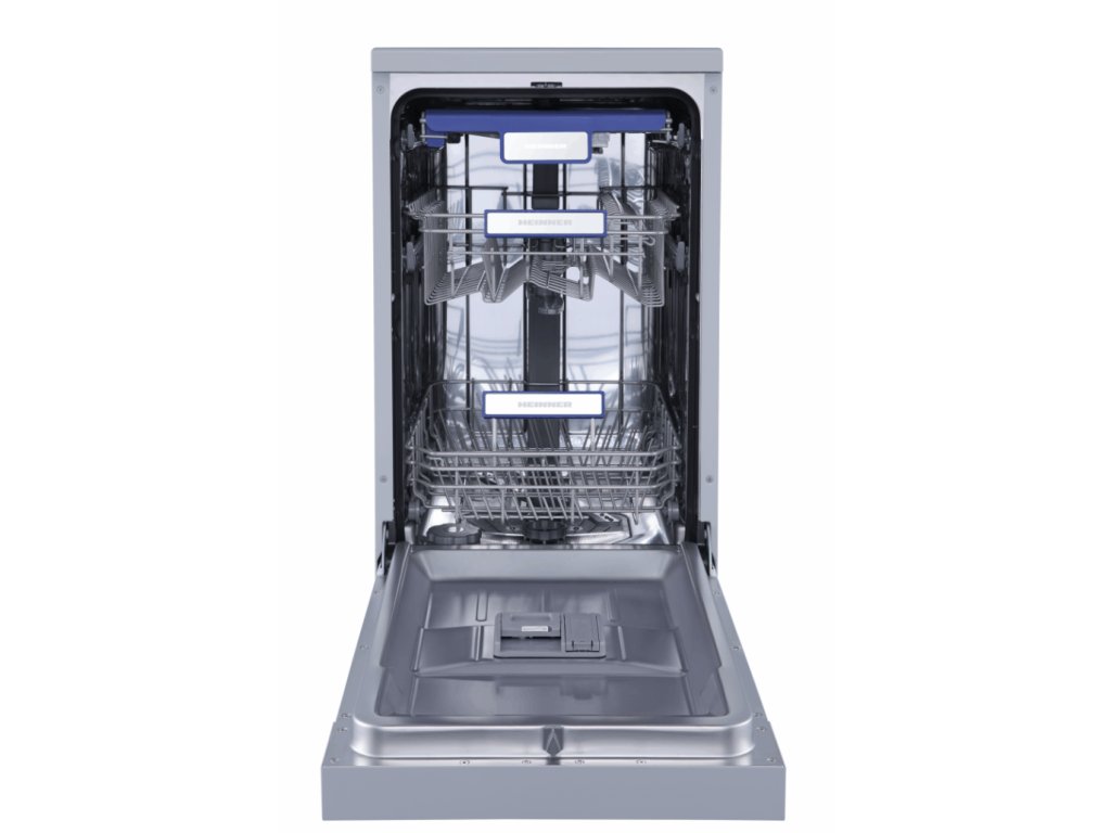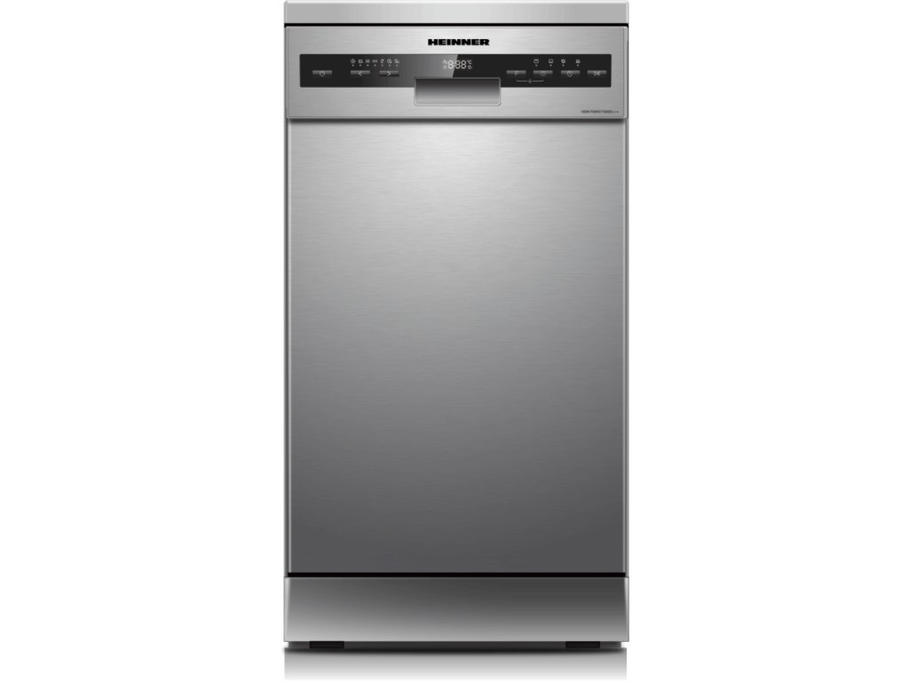 HEINNER HDW-FSM45710AXD+++ je volně stojící myčka nádobí s kapacitou až 10 sad nádobí, vhodná pro menší a střední domácnosti. Díky energetické třídě D nabízí optimalizovanou spotřebu energie a vody (pouze 8,5 litru na cyklus). Myčka disponuje sedmi programy – včetně rychlého (30 minut), Auto Smart programu (nastavení teploty 55–65 °C), 90minutového, intenzivního mytí s teplotou 65 °C a dalších funkcí pro poloviční náplň, extra čištění a sušení.