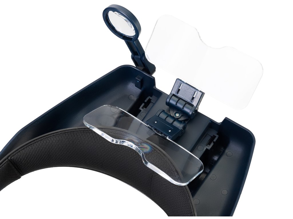 Optický systém náhlavní lupy obsahuje dvě hlavní čočky (obdélníkové, určené pro prohlížení oběma očima) a jednu malou kruhovou čočku (určenou pro jedno oko). Čočky lze odklopit do strany, můžete si tak zvolit lepší zvětšení. Sada obsahuje vyměnitelné čočky, které umožňují měnit i zvětšení. Všechny čočky jsou vyrobeny z polymerového optického skla, které na jedné straně poskytuje velmi jasný a kontrastní obraz a na druhé straně je velmi odolné.