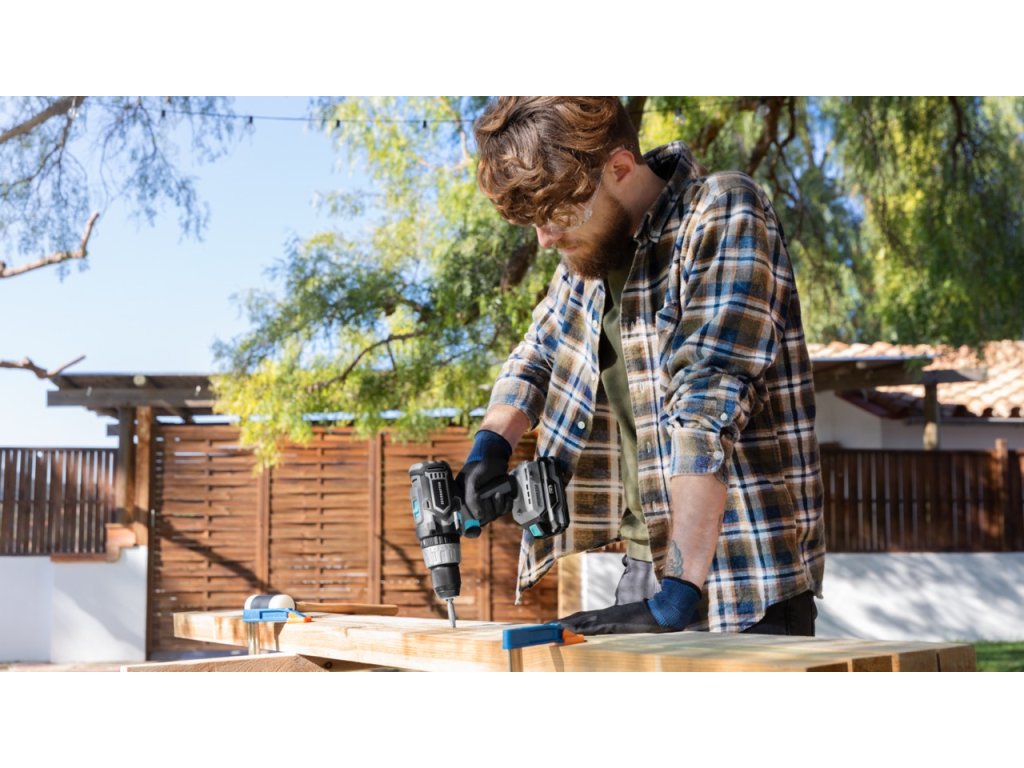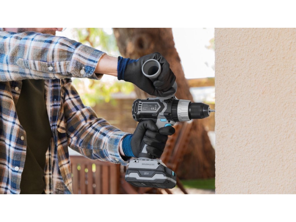 Akumulátorová příklepová vrtačka 20 V, 2000 mAh, bezkartáčová technologie, 2000 otáček za minutu bez zátěže, 30 000 úderů za minutu, maximální točivý moment 46 Nm s 25+1+1 polohami točivého momentu a 2 rychlostmi, rychloupínací automatické sklíčidlo 2-13 mm, pracovní osvětlení a až 30minutová autonomie.