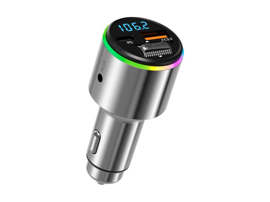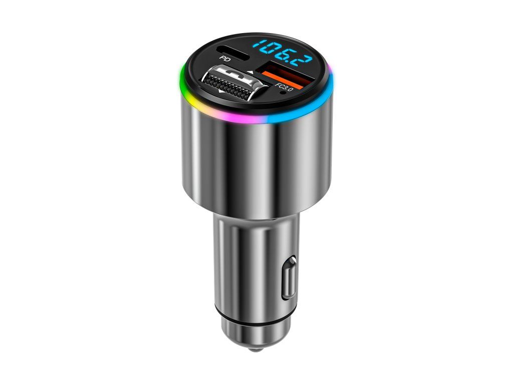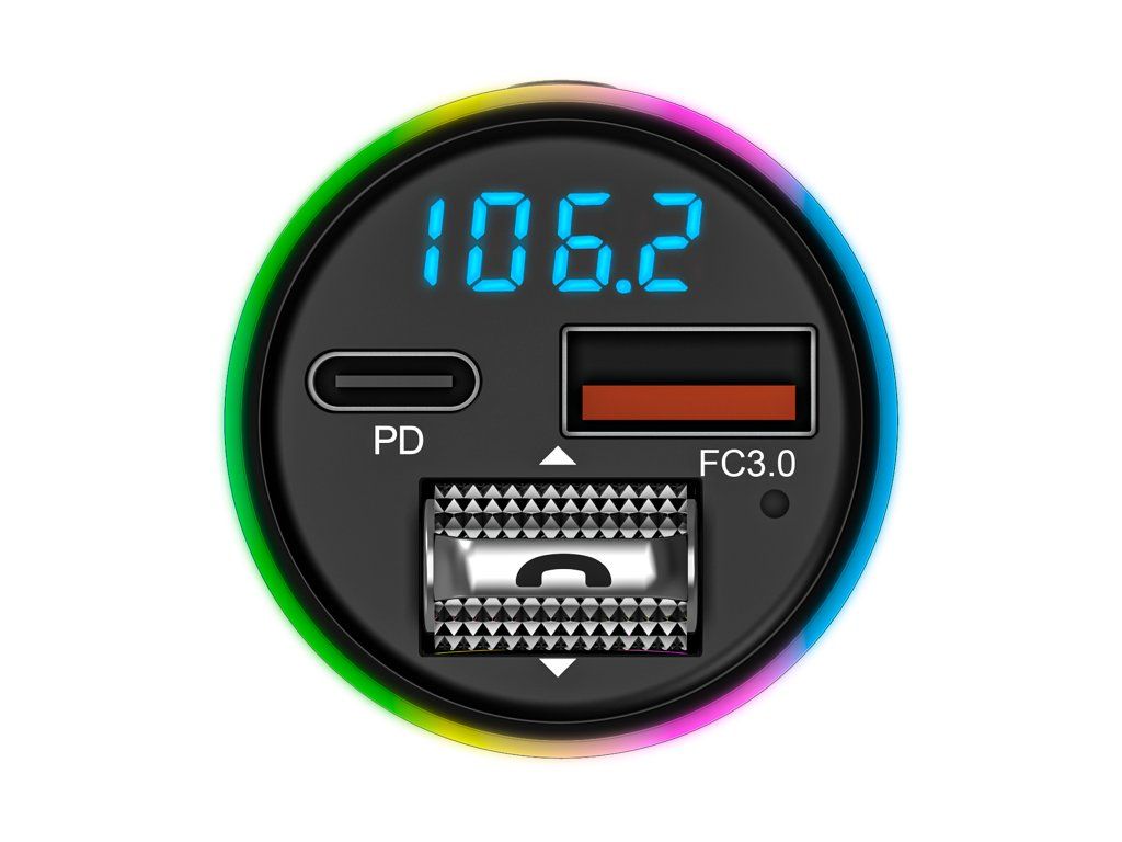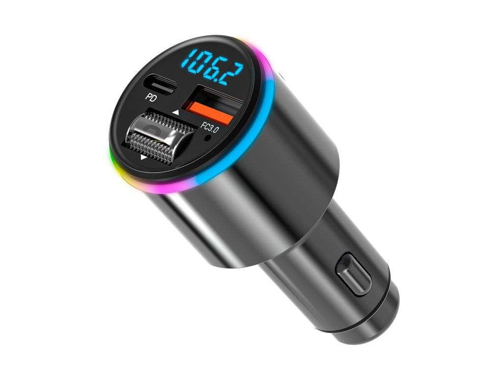 Zařízení je vybaveno dvěma USB porty – USB-C port s výstupním výkonem až 30 W a USB-A port s výkonem 18 W, které umožňují rychlé nabíjení mobilních telefonů, tabletů a dalších zařízení přímo ve voze. FM transmitter vysílá signál v rozsahu frekvencí 87,5 až 108,0 MHz, což umožňuje snadné nastavení a naladění do vašeho autorádia pro čistý a kvalitní zvuk.