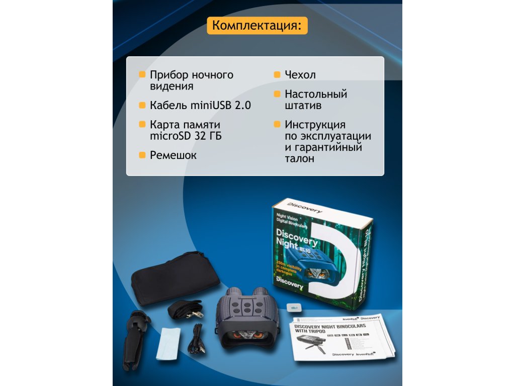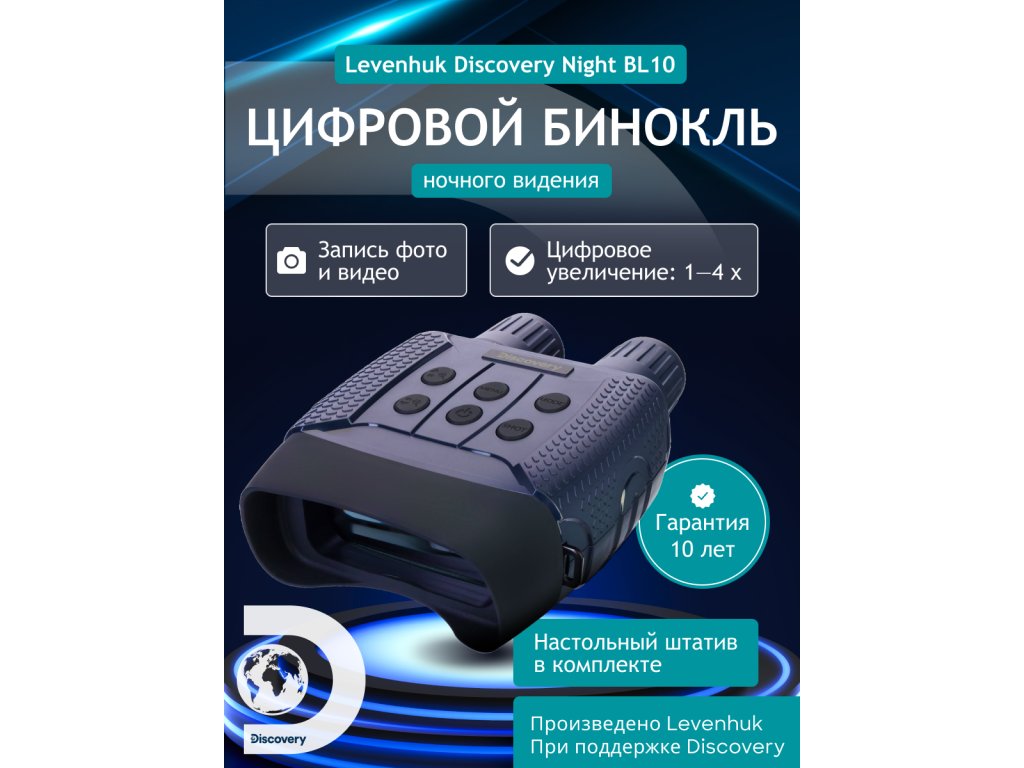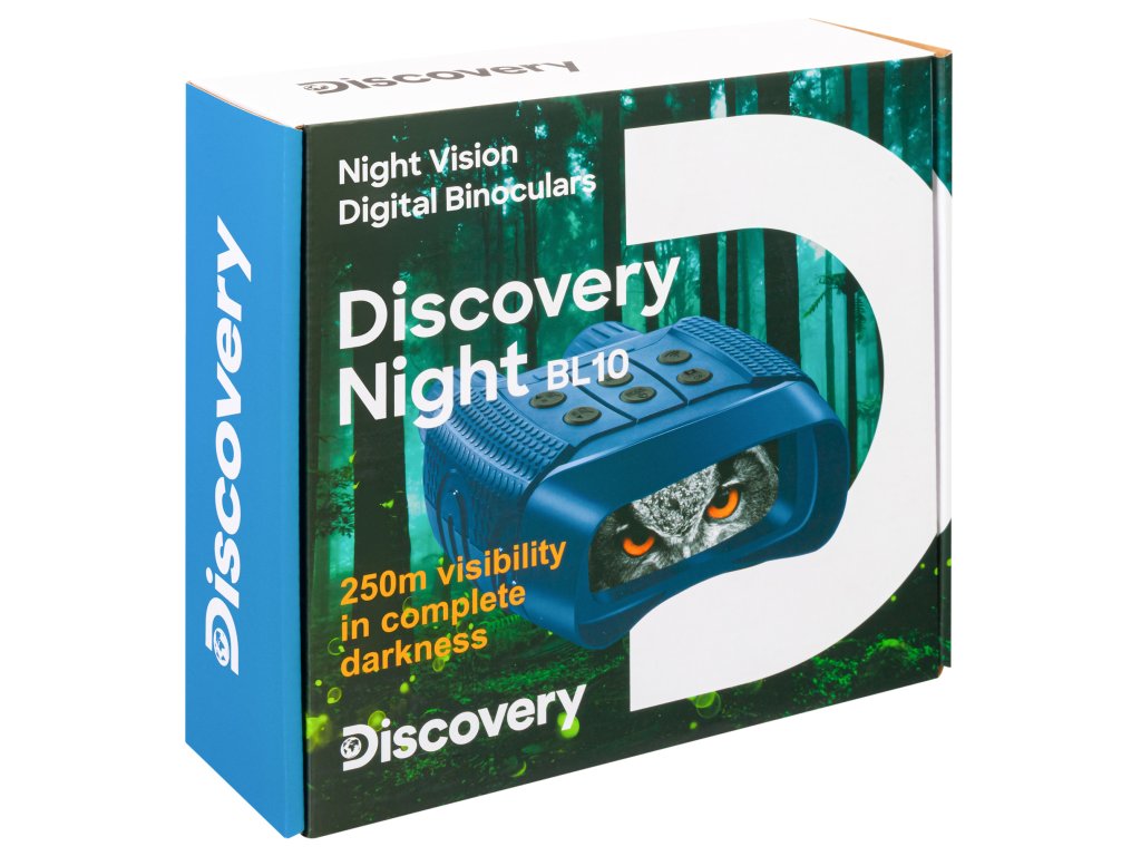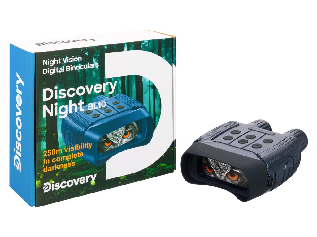 Levenhuk Discovery Night BL10 je binokulární dalekohled s nočním viděním s digitálním zesilovačem obrazu, který je praktický při použití za různých světelných podmínek. Má funkce záznamu fotografií a videa; je vybaven malým stolním stativem pro pohodlnější a stabilizované pozorování v terénu. Tento binokulární dalekohled s nočním viděním bude užitečný při nočním lovu, umožní vám zajistit bezpečnost tábora při trampování a bude vynikající volbou pro průzkum nových území. Levenhuk Discovery Night BL10 je totiž optické zařízení dva v jednom, které lze používat nejen v noci, ale i během dne jako běžný binokulární dalekohled!