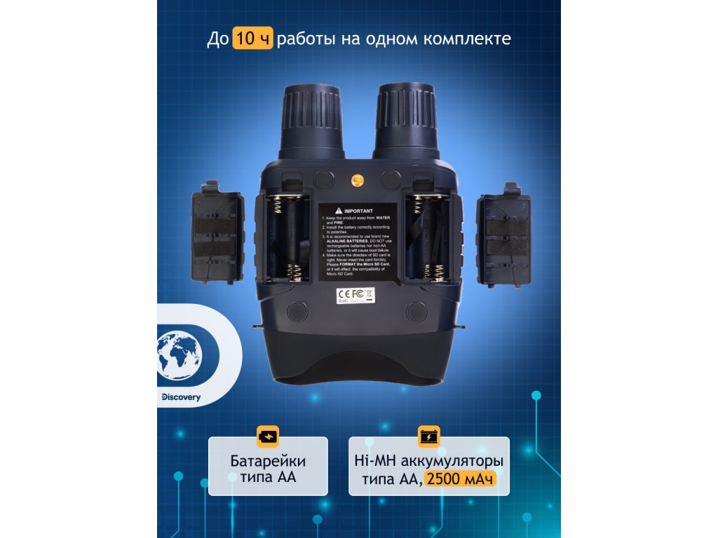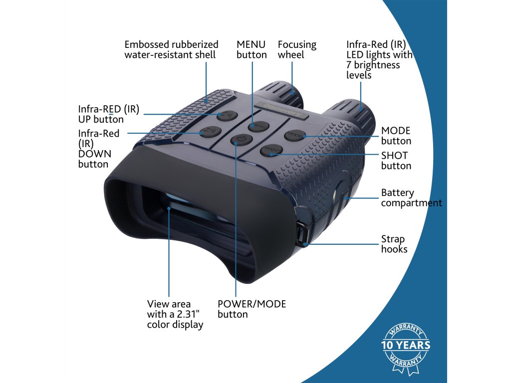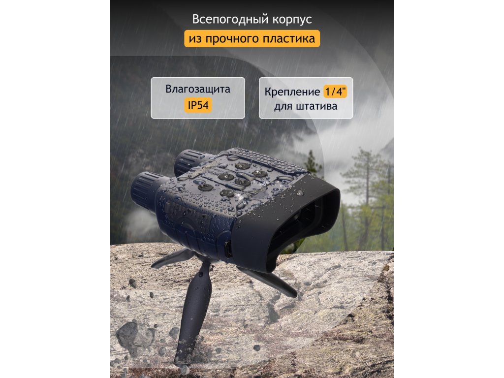 Když se nacházíte v terénu, je obzvláště důležité mít vybavení, na které se můžete spolehnout. Tělo binokulárního dalekohledu Levenhuk Discovery Night BL10 je voděodolné a ergonomický design zajišťuje pevný úchop; ovládací tlačítka jsou umístěna přímo pod konečky prstů. Ovládání je intuitivní a zařízení se snadno používá. Zařízení je napájeno standardními nebo dobíjecími Ni-MH bateriemi s výdrží 4 až 10 hodin nepřetržitého záznamu (v závislosti na intenzitě IR přísvitu). Součástí sady je malý skládací stativ, který stabilizuje polohu binokulárního dalekohledu s nočním viděním pro zachycení snímků bez zkreslení.