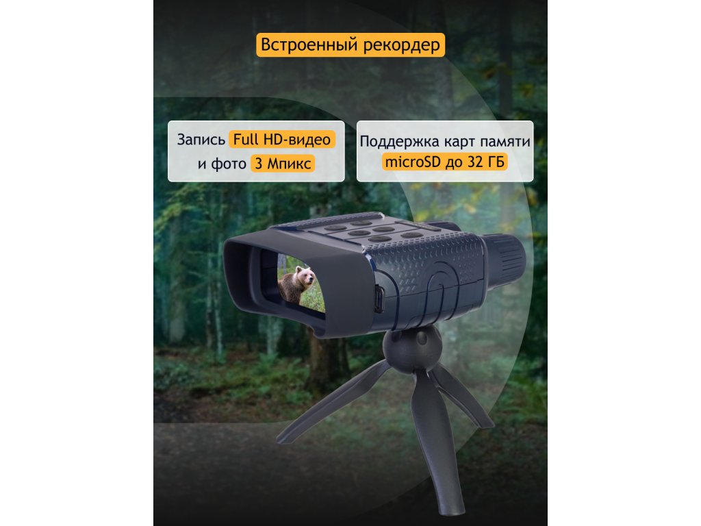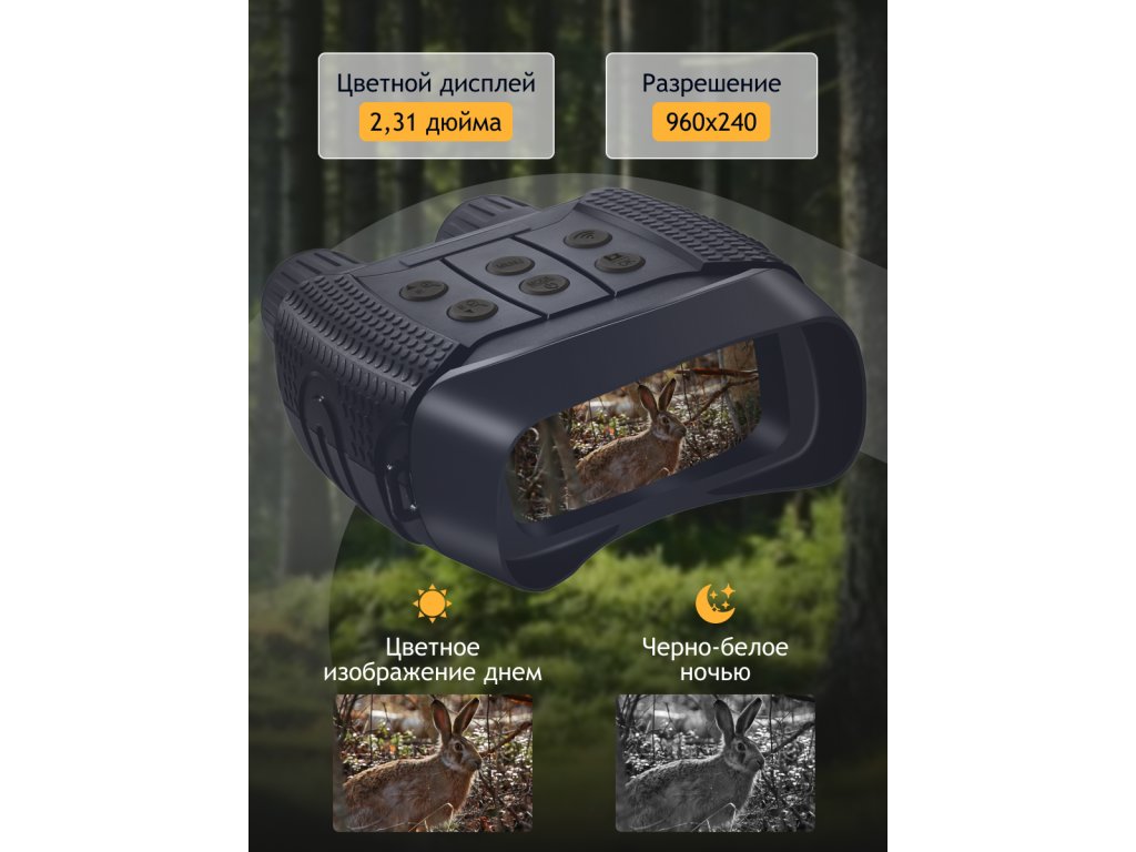 Plně potažená optika s vrstvou oxidu křemičitého, která poskytuje ostrý a vysoce kontrastní obraz. Zařízení s efektivním přenosem světla dokáže ve dne jasně zobrazit objekty na vzdálenost od 3 metrů. Zorné pole v noci je 250 metrů. Je lepší zapnout vestavěný IR přísvit, čímž se zlepší viditelnost, zatímco zůstanete skrytí pro ostatní, včetně plachých divokých zvířat. Jas IR přísvitu lze nastavit se 7 úrovněmi jasu. Vezměte prosím na vědomí, že zařízení může produkovat barevný obraz, černobílý obraz, jasně zelený obraz nebo obraz s efektem barevného filmu. Nicméně, v případě zapnutého nočního režimu není barevný obraz k dispozici.