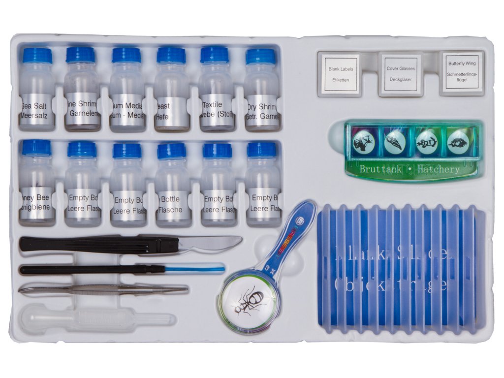 V sadě je několik hotových preparátů, které lze studovat ihned po vybalení. Pro účely množení žábronožek jsou v sadě lahvičky s jejich vajíčky a kvasnicemi. Ty jsou potřeba k urychlení růstu žábronožek.