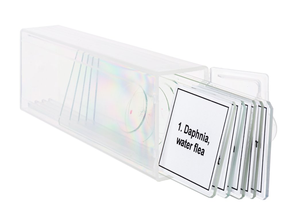 Sada mikropreparátů Levenhuk Discovery Prof DPS 5. Sada „Život v kapce vody“ obsahuje pět preparátů biologických vzorků profesionální kvality, konkrétně následujících obyvatel sladké vody: bakterií, prvoků, členovců a planktonu.