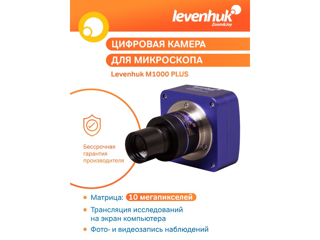 Desetimegapixelový digitální fotoaparát Levenhuk M1000 PLUS je výkonným doplňkem pro fotografování mikrosvěta. Umožňuje fotografovat s rozlišením až 3584 x 2748 pixelů. Můžete také nahrávat plynulé a barevné videozáznamy, sdílet fotografie zajímavých momentů z výzkumu s lidmi podobných zájmů a vysílat videa z vašeho bádání. Fotoaparát je kompatibilní s biologickými a stereoskopickými mikroskopy všech značek.