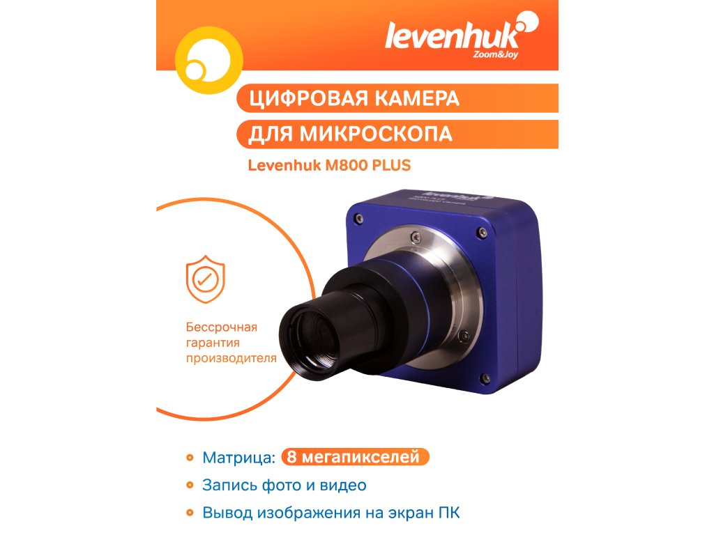 Digitální fotoaparát Levenhuk M800 PLUS pro mikroskopy byl navržen k profesionální práci s mikroskopickými preparáty. Fotoaparát nabízí široké možnosti fotografování a nahrávání videa. Snímač s rozlišením 8 megapixelů poskytuje fotoaparátu obrazové rozlišení 3264 x 2448 pixelů a možnost nahrávat vysoce kvalitní video o rychlosti 62 fps. Fotoaparát Levenhuk M800 PLUS je vhodný pro zájmovou činnost, studium a práci.