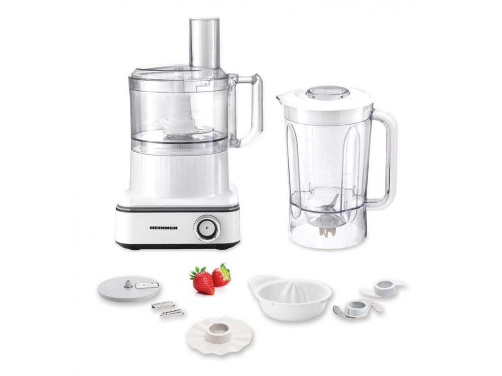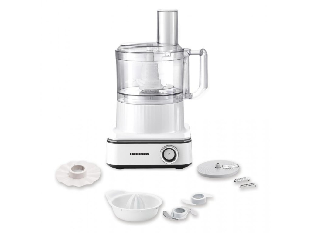 HEINNER kuchyňský robot HFP-K1000WP s výkonem 1000 W a bohatým příslušenstvím usnadní každodenní přípravu jídel. Prostorná nádoba o objemu 2,3 litru, 6 rychlostních stupňů a pulsní funkce zajistí perfektní výsledky při mixování, hnětení i sekání.