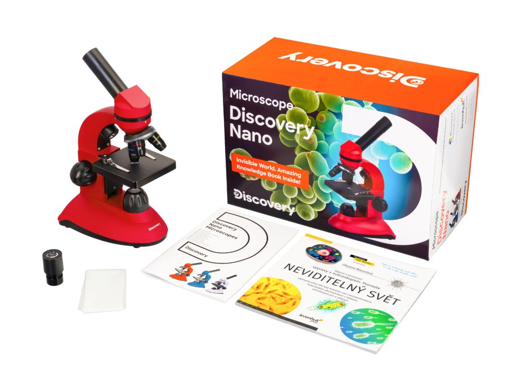 Levenhuk Discovery Nano je klasický monokulární mikroskop základní úrovně pro pozorování vzorků při zvětšení 40—400x. Tímto mikroskopem můžete studovat jak hotové preparáty ze sad, tak i vlastní preparáty. Mikroskop je skvělou volbou pro první seznámení s mikrosvětem a umožňuje vám doma provádět jednoduché vědecké experimenty. Stane se skvělým pomocníkem při studiu biologie ve škole. Sada obsahuje vše, co je nezbytné pro pozorování, včetně příslušenství a také barevnou vzdělávací publikaci "Neviditelný svět".