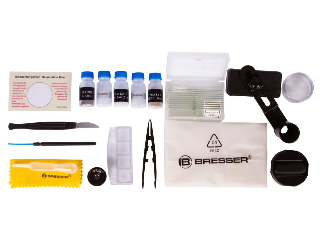 The Bresser Junior Microscope has up to 2000x magnification and a new innovative Smartphone Mount that allows you to take photos through the microscope. To ensure you're fully equipped, the accessories included provide the perfect introductory equipment. This includes, among other things, two wide-field eyepieces, a colour filter disk, many slides and storage containers. With its elegant Bresser design, the microscope has many useful features . The adjustable LED illumination can be used as an incident light for viewing opaque objects and as transmitted light for viewing transparent objects.