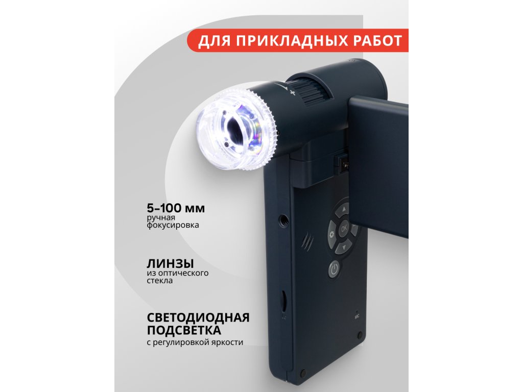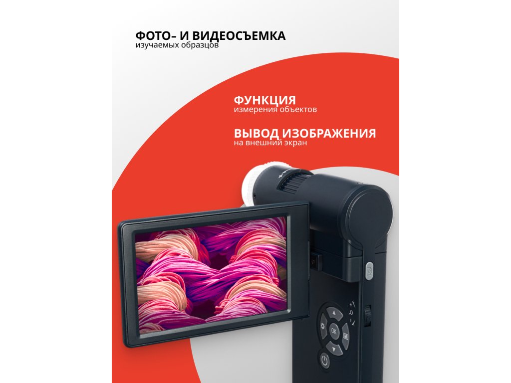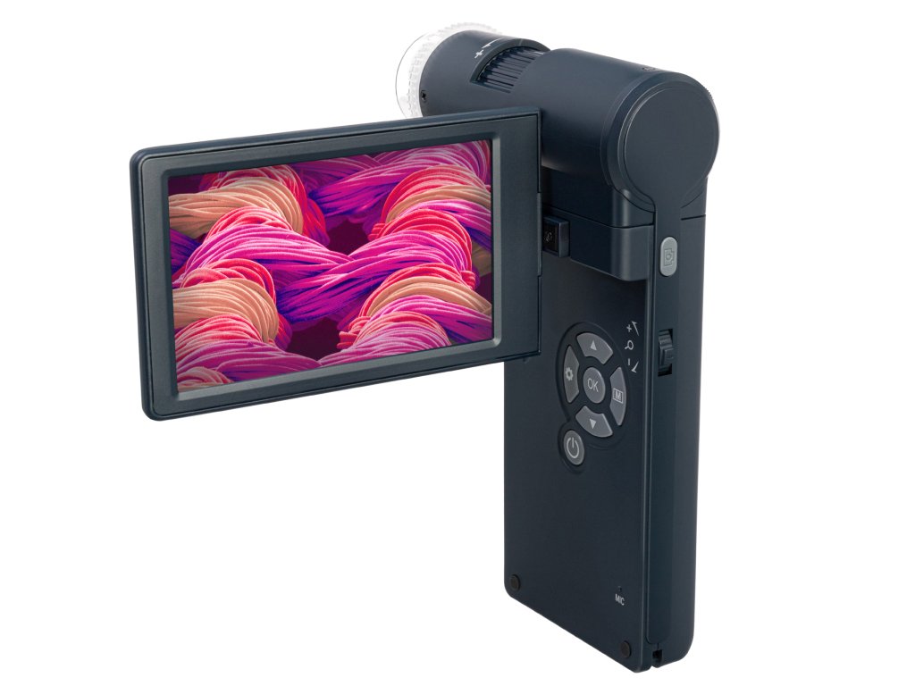 Mikroskop je vybaven otočnou barevnou 4″ LCD obrazovkou. Obrázek pod objektivem se na obrazovce zobrazuje v reálném čase. Mikroskop umožňuje zachycení snímků a videí ve vysokém rozlišení. Tato funkce vyžaduje paměťovou kartu, kterou je třeba zakoupit samostatně. Podporovány jsou karty MicroSD o kapacitě do 32 GB. V případě potřeby lze mikroskop připojit k externímu zařízení: k monitoru, k televizi nebo k počítači. Veškeré potřebné kabely jsou již součástí sady. Před připojením mikroskopu k počítači nezapomeňte nainstalovat přiložený software. Ten nabízí přístup k rozšířeným funkcím, jako je měření délky nebo úhlu objektů.