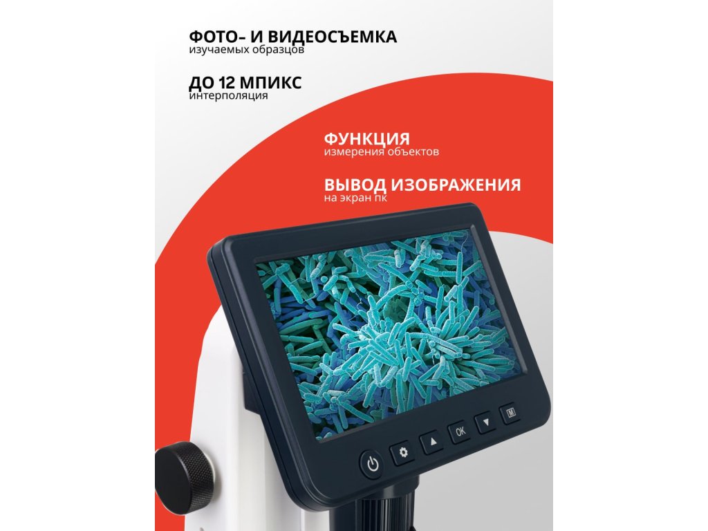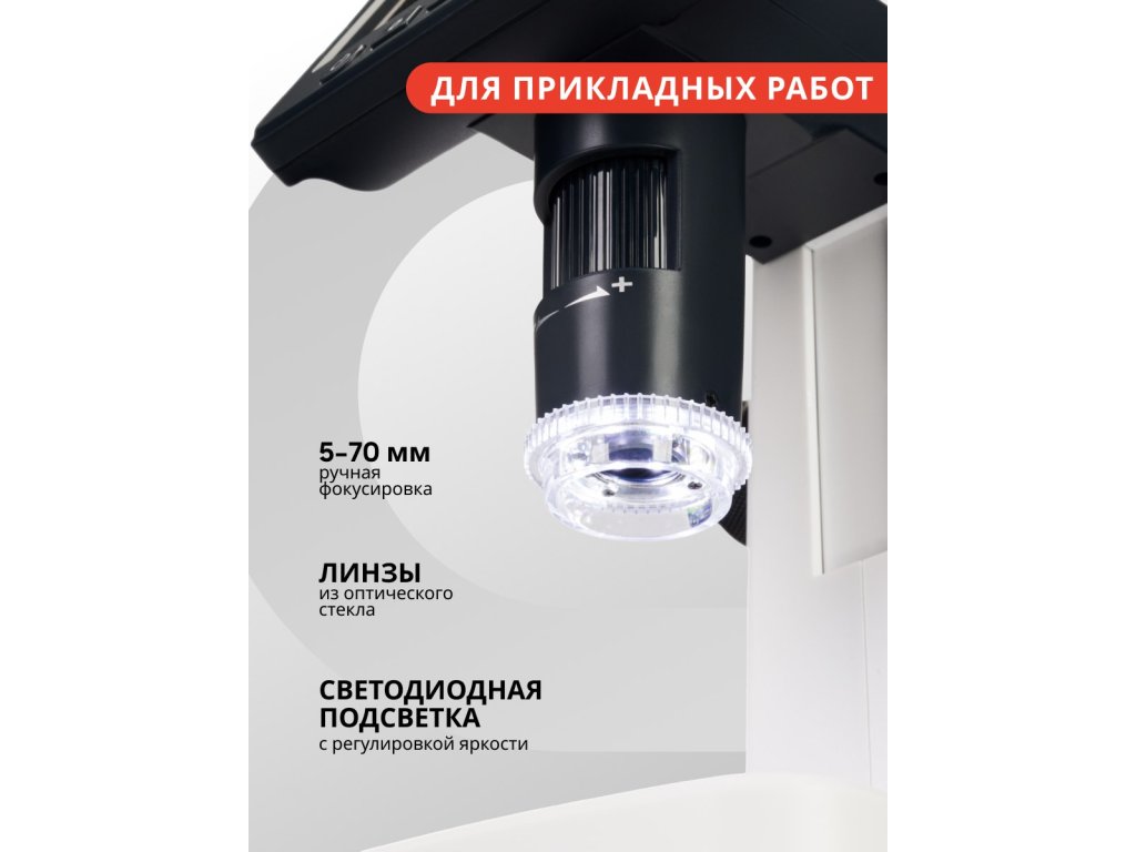 Uvedené obrázky byly pořízeny 5 Mpx kamerou mikroskopu. Jas LED osvětlení lze nastavit pro optimální podmínky pozorování. Fotoaparát poskytuje zvětšení 10–300x a s dalším přiblížením lze pozorovat objekty při zvětšení až 1200x. Barevný a podrobný snímek se přenáší na zabudovanou 5″ LCD obrazovku. Tato obrazovka usnadňuje dlouhodobou práci s přístrojem, neboť je mnohem praktičtější objekt sledovat na obrazovce než v okuláru klasického mikroskopu. Barevná obrazovka má dobré rozlišení obrazu.