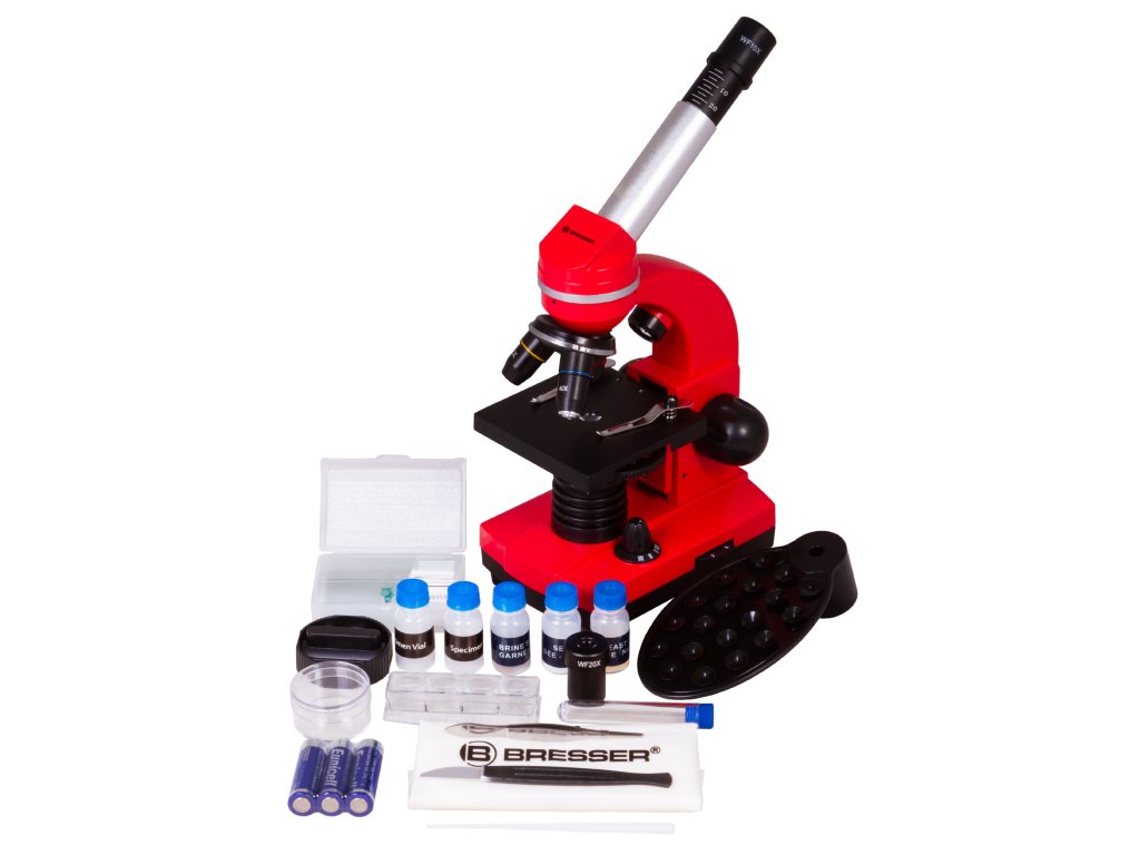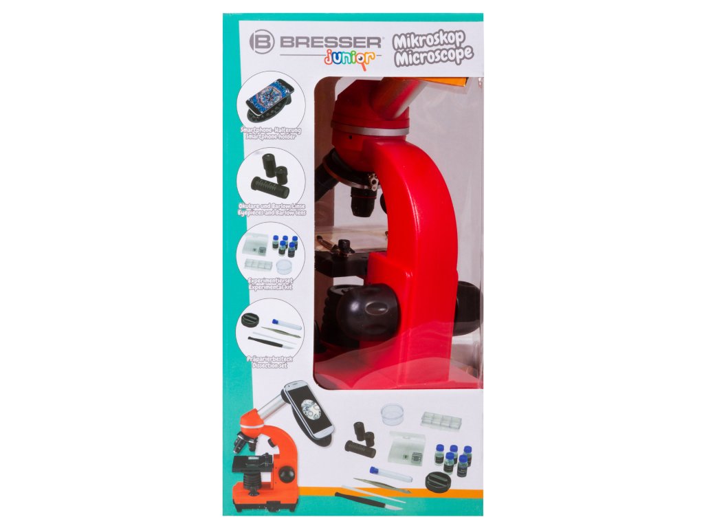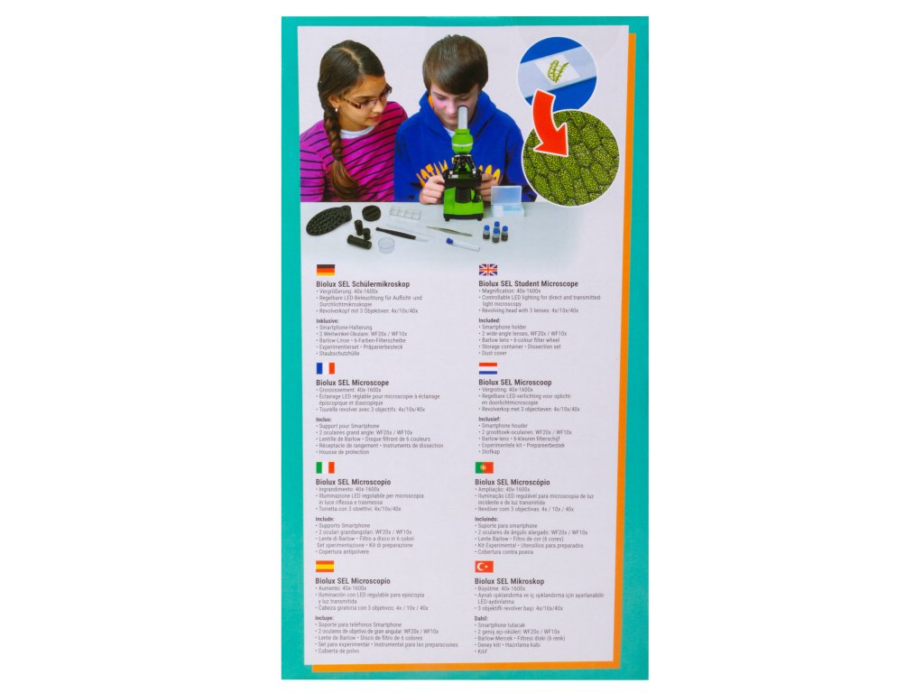 Bresser Junior Biolux SEL 40–1600x microscope with its extensive range of accessories offers an optimal introduction to microscopy. Unique to these models is the Barlow zoom system in the eyepiece socket: by means of a pull-out additional lens, the magnification can be continuously changed up to 2 times during visual observation, so that together with 3 objectives and 2 interchangeable wide-field eyepieces magnifications of 40x to 1600x can be achieved.