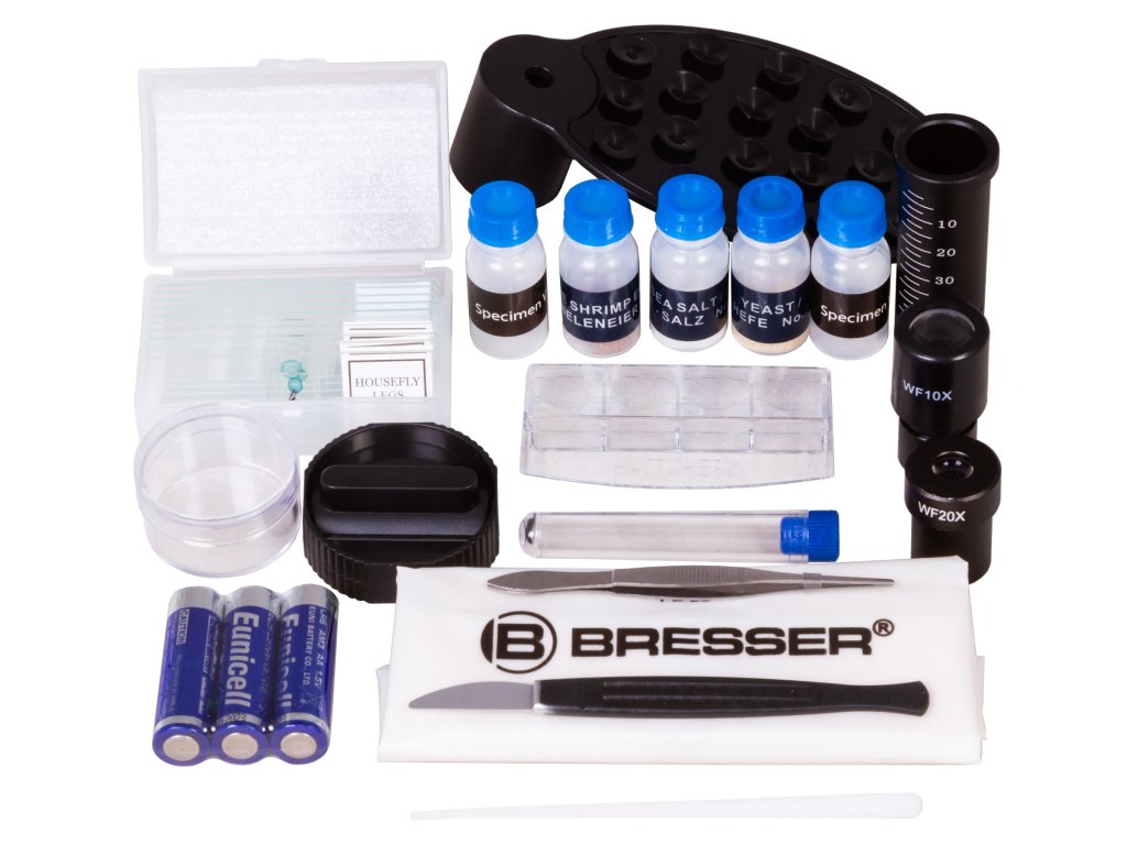 The power supply is provided by batteries (three pieces type AA), so that microscopic work can also be carried out in the vicinity without a socket. The accessories already include permanent specimens and 5 empty slides and cover glasses for making your own specimens. The set also includes a preparation set consisting of a MicroCut, a knife, a pair of tweezers, a stick and a tube.