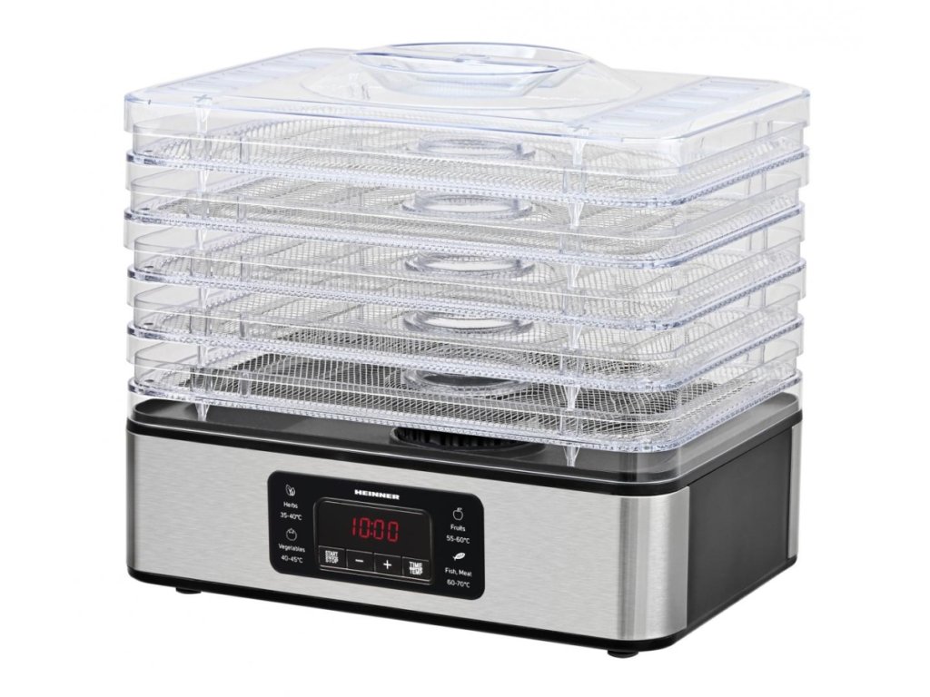 Nerezová sušička potravin Heinner s nastavitelnou teplotou zajistí šetrné a rovnoměrné sušení ovoce, zeleniny i bylinek. Disponuje několika sušicími pláty a přehledným ovládáním pro optimální výsledky. Elegantní nerezové provedení zaručuje dlouhou životnost a snadnou údržbu v každé kuchyni.