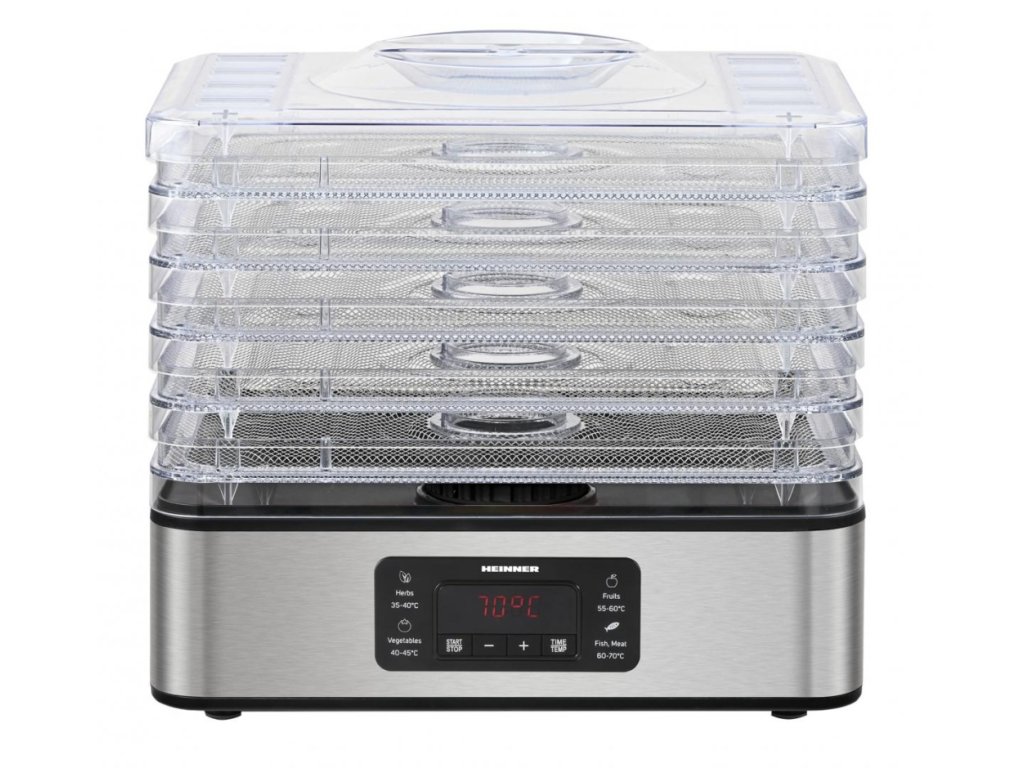 Sušička potravin HEINNER HFD-K400SS je ideálním řešením pro milovníky domácích křížal, sušeného masa, hub nebo bylinek. Nerezové provedení zajišťuje vysokou odolnost a profesionální vzhled. Díky rovnoměrnému proudění vzduchu a přesné regulaci teploty si potraviny zachovávají maximum vitamínů, minerálů a především svou přirozenou chuť bez přidaných konzervantů.