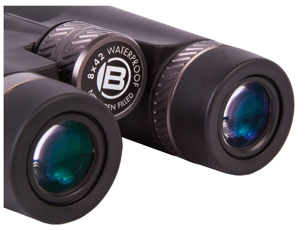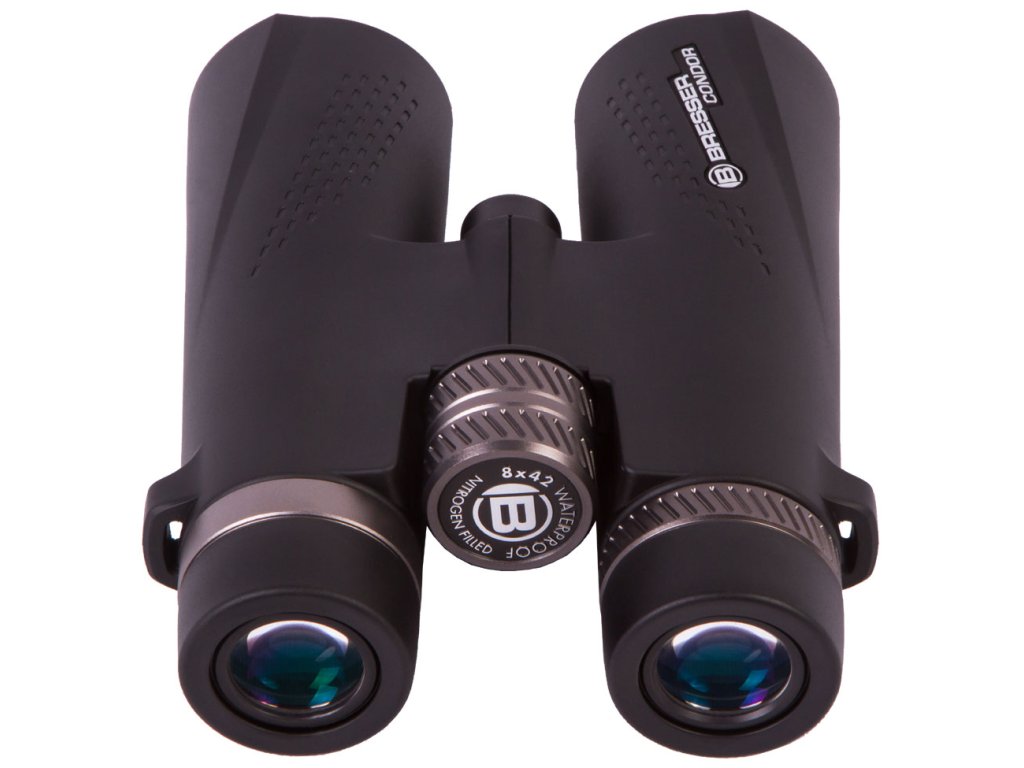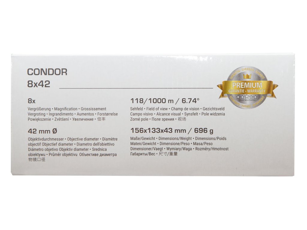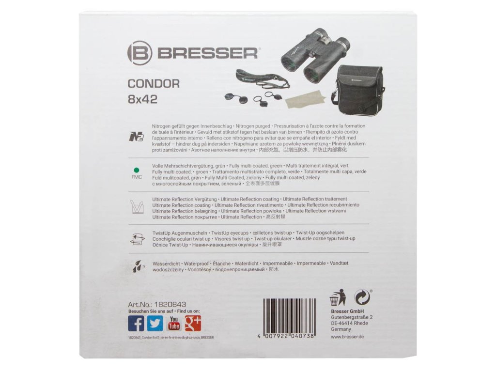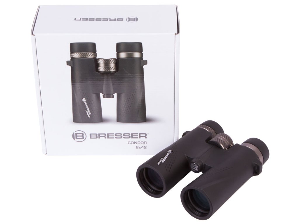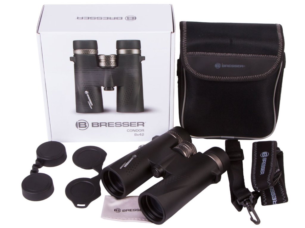 Binokulární dalekohled Bresser Condor 8x42 přináší extrémně jasný a kontrastní obraz. Tento praktický univerzální binokulární dalekohled je vodotěsný a plněný dusíkem. Jeho hlavní předností je však samozřejmě výtečná optika. Díky optickým hranolům BaK-4 a speciálnímu povrchu pro dokonalý odraz (UR) tento binokulární dalekohled přenáší více světla. Čočky objektivů o průměru 42 mm umožňují pohodlné pozorování dokonce i za šera. Všechny čočky jsou dokonale pokryty několikanásobnou antireflexní vrstvou. Přenášený obraz je extrémně sytý, ostrý a jasný.