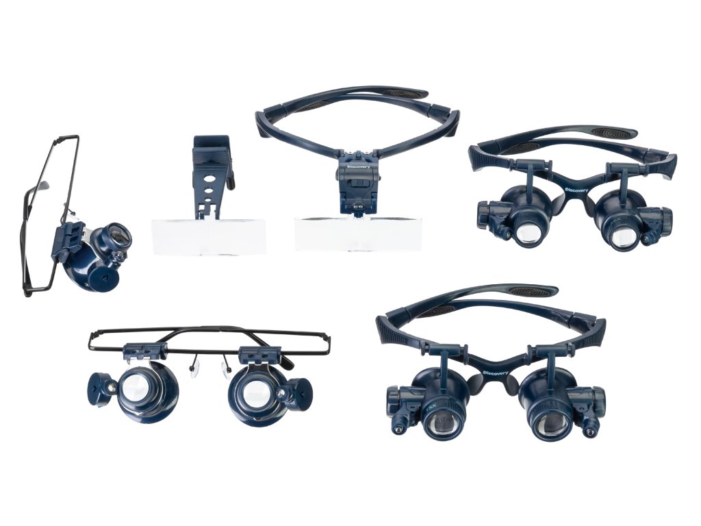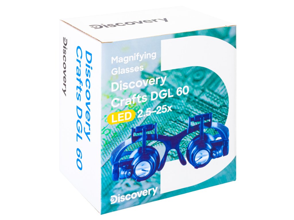 Zvětšovací brýle Levenhuk Discovery Crafts DGL 60 jsou doplněny 8 párovými sadami vyměnitelných čoček a dvěma držáky na hlavu – textilní čelenkou a brýlovou obrubou. Díky tomu je tato lupa ideální pro práci s malými předměty, protože její rozměr lze snadno upravit tak, aby vyhovovala každému uživateli. Tato lupa je vybavena osvětlením, takže můžete snadno pracovat i v úplné tmě.